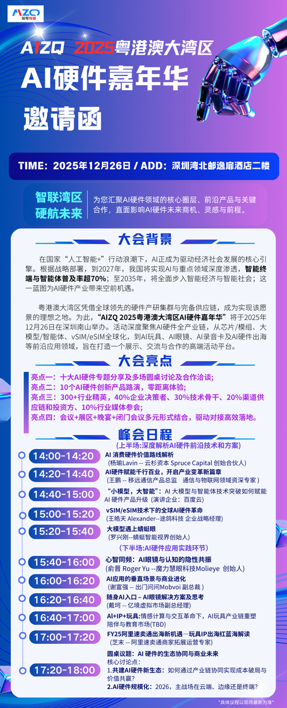 2025年12月26日下午13:00-18:00,深圳湾北邮逸扉酒店。 我们诚挚邀请每一位AI硬件的造梦者、实干家与前瞻者,共聚于此。一起“智联湾区”,共同开启“硬航未来”的新篇章!