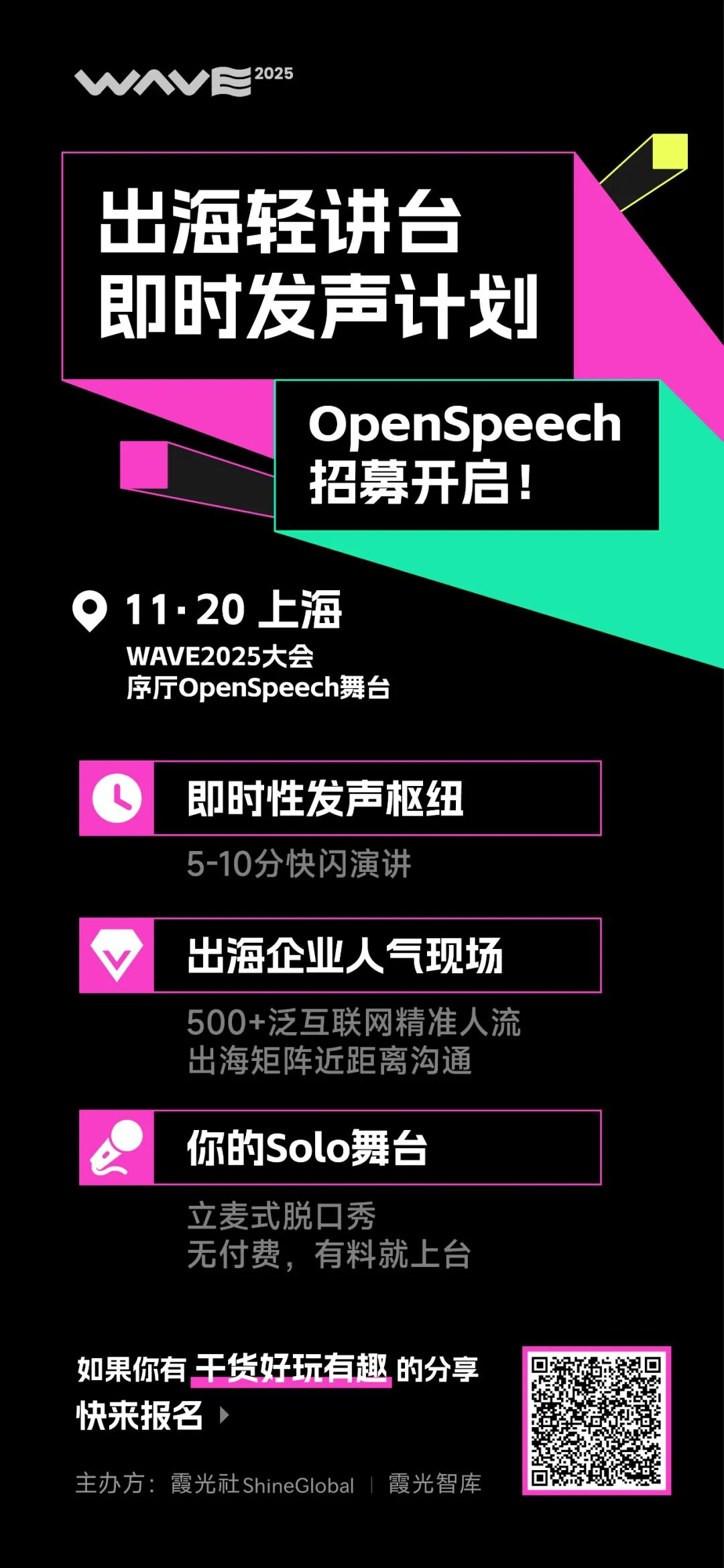 在这一背景下,霞光社 WAVE2025 泛互联网全球领航者大会即将如约而至。大会将汇聚全球洞察与实践者,共同探讨 2026 年泛互联网出海的趋势与应对策略——在不确定中寻找新的确定,为中国泛互联网企业提供高质量的交流与合作平台。
