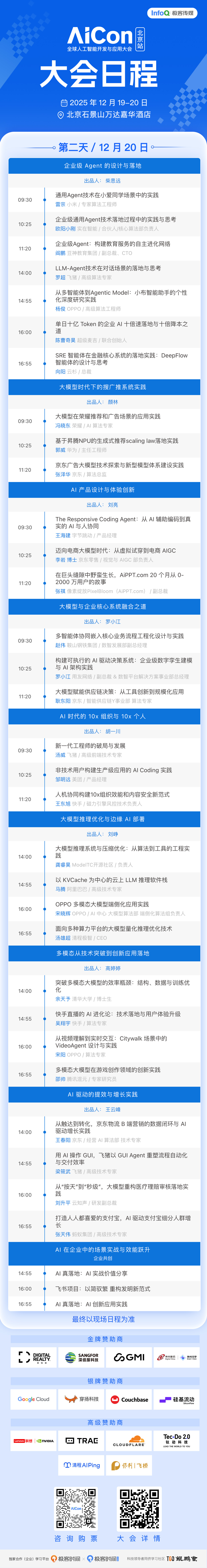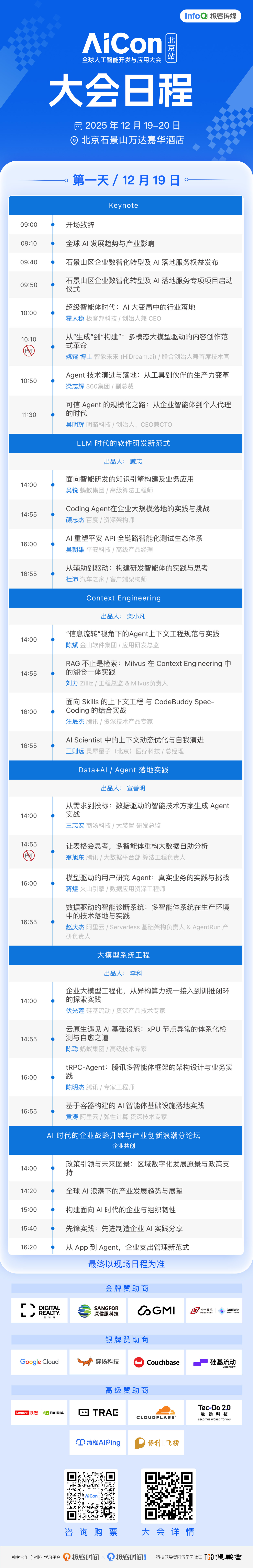 将于 12 月 19~20 日在北京举办的 AICon 全球人工智能开发与应用大会 将围绕这一产业命题展开系统性探索,重点聚焦 AI Agent、研发范式革新与组织变革、大模型推理优化等关键方向。来自腾讯、阿里巴巴、字节跳动、百度、蚂蚁集团、京东、华为等多家领先企业的技术与管理实践者将共同分享如何构建可信赖、可规模化、可商业化的智能系统,以及 AI 如何成为企业降本增效、突破增长天花板的核心驱动力。